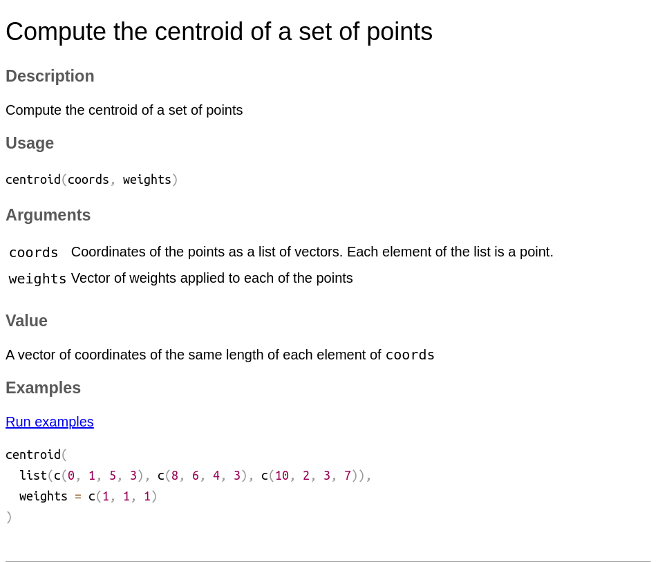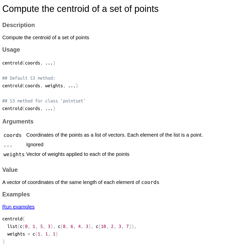 centroid() documentation after conversion to an S3 genericThe answer is that “Default S3 method” lists the arguments for centroid.default(), i.e., the method which is used if no other method is defined for your class. Arguments for all methods are usually documented together but you should only focus on those present in the call after the comment stating “S3 method for class ‘XXX’” for the class you’re working with.